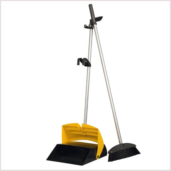 Behälter und Besen mit langen Stiel ermöglichen ein ergonoisches Kehren ohne Bücken. Mit dem verstellbaren Haken lässt sich das Set variabel am Reinigungswagen mitführen bzw. leicht verstauen. Der Besen wird hygienisch im geschlossenen Behälter verstaut.